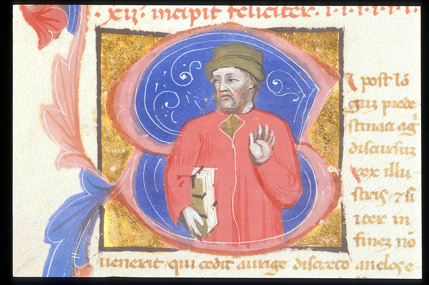 Londra, British Library, Egerton 1865, f. 129v. Il manoscritto è datato 23 giugno 1388. Un uomo a mezzobusto vestito di rosso con un libro sotto braccio, all'interno dell'iniziale figurata S(i post).