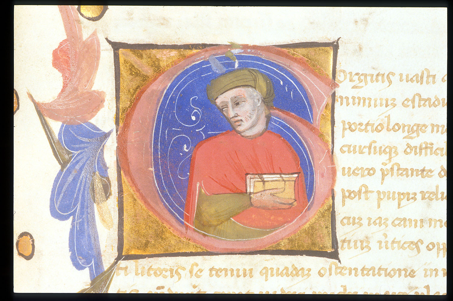 Londra, British Library, Egerton 1865, f. 141r. Il manoscritto è datato 23 giugno 1388. Un uomo a mezzobusto con un libro, all'interno dell'iniziale figurata G(urgitis).
