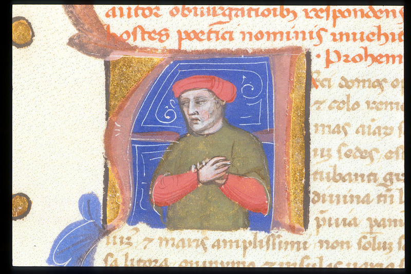 Londra, British Library, Egerton 1865, f. 149v. Il manoscritto è datato 23 giugno 1388. Un uomo a mezzobusto con le mani giunte, all'interno dell'iniziale figurata A(rci).