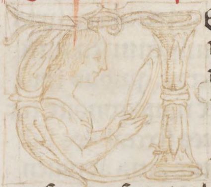 Cambridge (Mass.), Harvard University, Houghton Library, Richardson 41, f. 2v. La dea Venere, raffigurata come una donna che si guarda in uno specchio, all'interno dell'iniziale figurata V(enerem).