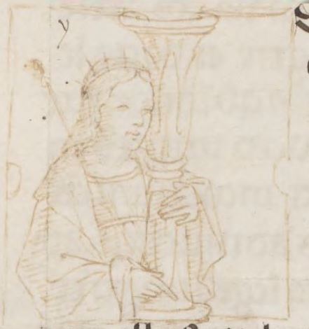 Cambridge (Mass.), Harvard University, Houghton Library, Richardson 41, f. 3r. La regina d'Egitto Iside, raffigurata con una corona e uno scettro, all'interno dell'iniziale figurata I(sis).