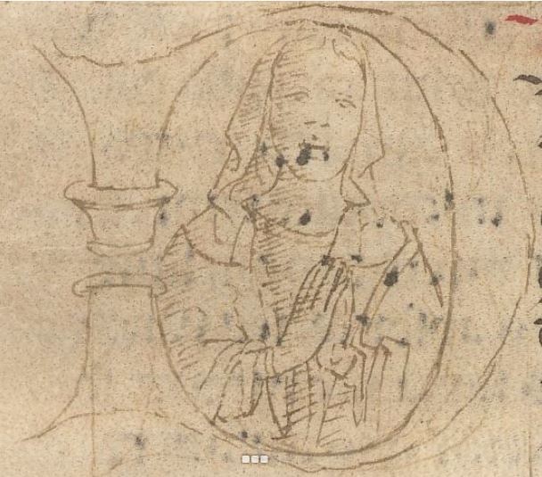 Cambridge (Mass.), Harvard University, Houghton Library, Richardson 41, f. 10v. Busto di donna in preghiera, all'interno dell'iniziale figurata D(ido).