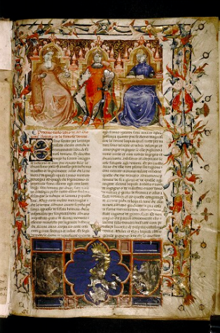 Oxford, Bodleian Library, Canon. Ital. 86, f. 1r. Tre personaggi femminili seduti in trono: a sinistra una donna dalla veste rosa con un cagnolino addomesticato (allegoria della Stoltezza?), al centro una donna dalla veste rossa con un'armatura e una spada (allegoria della Giustizia?), a destra una donna dalla veste blu con dei libri posti su un leggio (allegoria della Saggezza?).