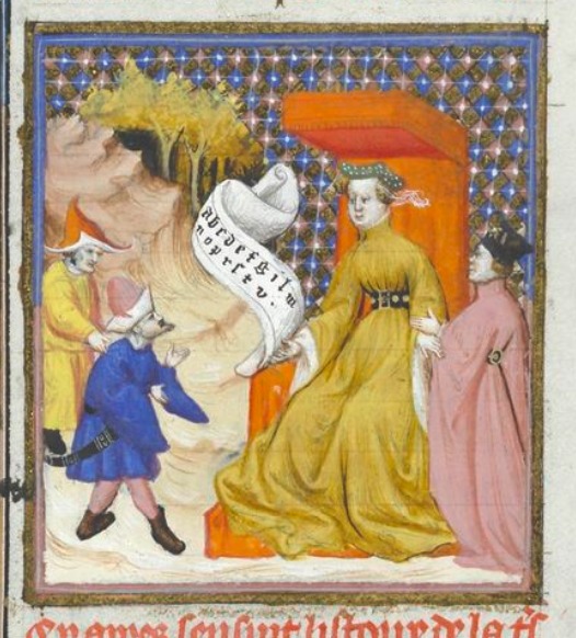 Bruxelles, Koninklijke Bibliotheek van België, 9509, f. 37r. La profetessa Carmenta insegna l'alfabeto ad alcuni poveri stranieri.