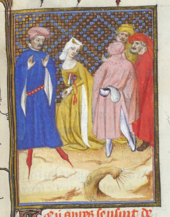 Bruxelles, Koninklijke Bibliotheek van België, 9509, f. 72r. Lucrezia compie il suicidio dinanzi al padre e al marito.