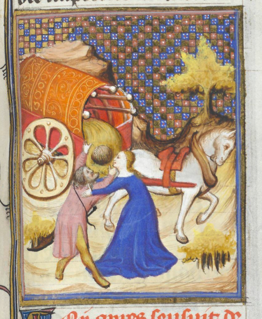 Bruxelles, Koninklijke Bibliotheek van België, 9509, f. 96r. La vestale Claudia impedisce che suo padre venga gettato giù dal carro trionfale.