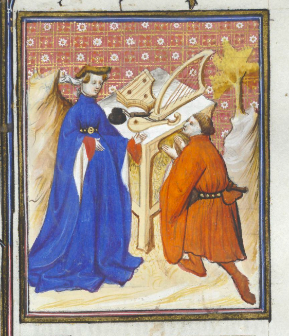 Bruxelles, Koninklijke Bibliotheek van België, 9509, f. 120r. Sempronia viene corteggiata da un uomo; accanto ai due si trova un tavolo su cui sono poggiati degli strumenti musicali ed un calamaio.