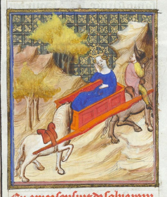 Bruxelles, Koninklijke Bibliotheek van België, 9509, f. 143v. Poppea, moglie di Nerone, viene portata via in lettiga.