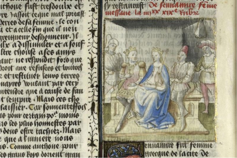 Chantilly, Bibliothèque du Château de Chantilly, 856, f. 119v. Semiamira siede sul trono insieme al figlio e ad un consigliere (il modello è frainteso).