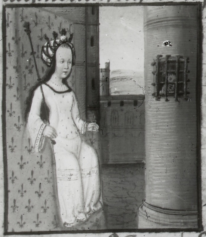 Dresda, Sächsische Landesbibliothek, F 171 b, f. 19v. Ipermestra seduta sul trono; sulla destra all'interno di una torre attraverso una finestra chiusa da una grata si scorge la figura di un uomo.