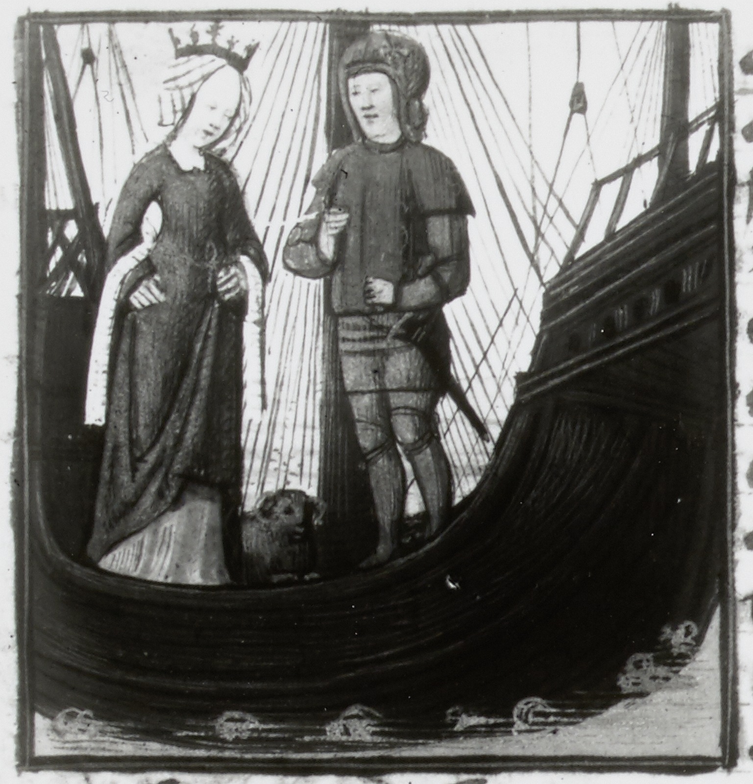 Dresda, Sächsische Landesbibliothek, F 171 b, f. 23v. Medea e Giasone su una nave; ai loro piedi è un piccolo montone che simboleggia il vello d'oro cercato dagli Argonauti.