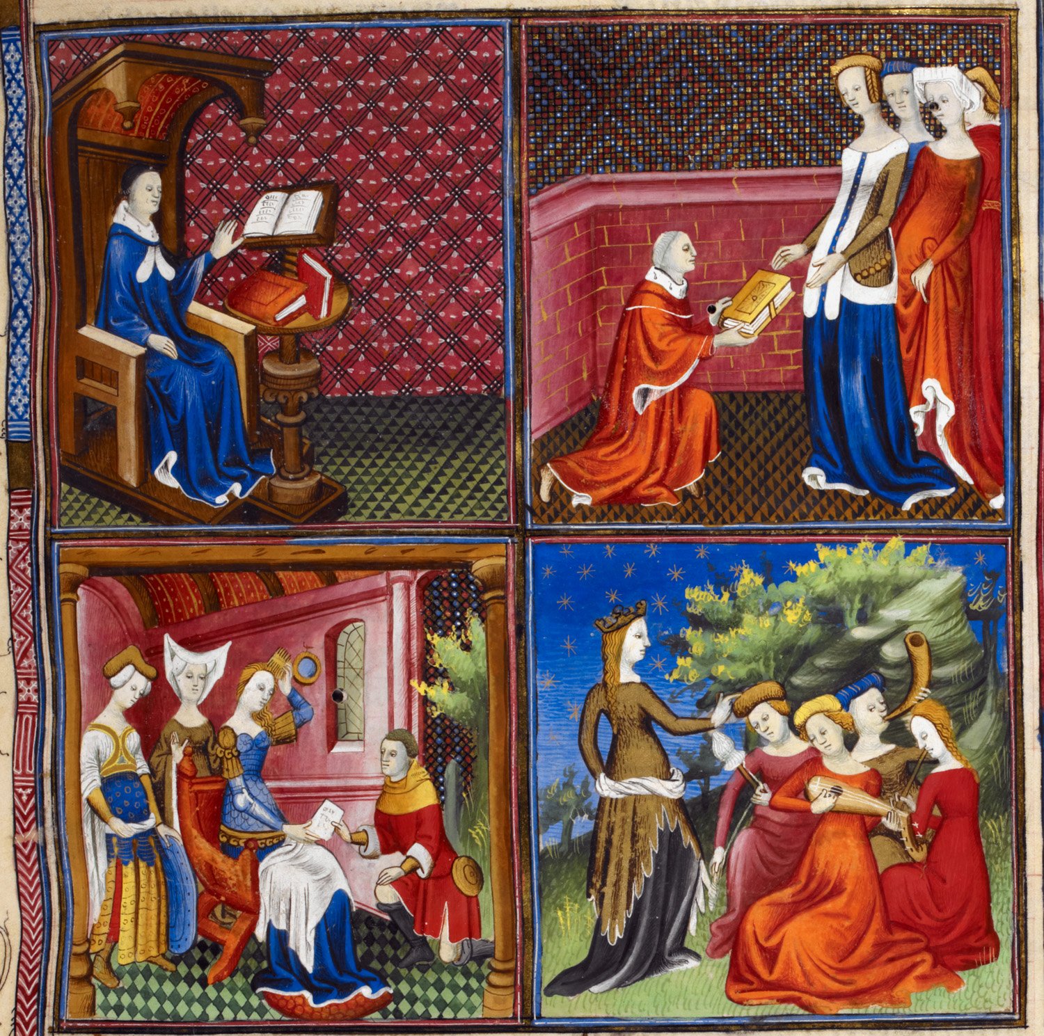 Londra, British Library, Royal 20 C V, f. 5r. L'autore Giovanni Boccaccio siede in cattedra dinanzi a un leggio su cui sono posati dei libri; Boccaccio presenta il libro ad Andrea Acciaiuoli; Semiramide riceve da un messo la notizia della caduta di Babilonia; una regina guida un gruppo di nobildonne che suonano degli strumenti sedute in un prato.