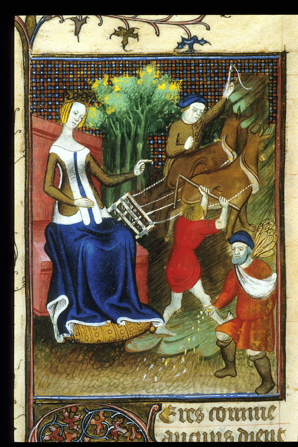 Londra, British Library, Royal 20 C V, f. 13r. Cerere insegna a tre contadini ad arare, seminare e trebbiare.