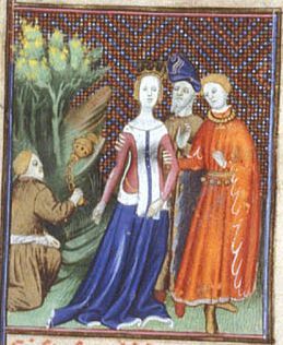 Londra, British Library, Royal 20 C V, f. 16v. Venere accanto a Vulcano, Adone e un uomo devoto inginocchiato che reca un turibolo.