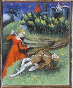 Londra, British Library, Royal 20 C V, f. 22r. Tisbe compie il suicidio accanto al corpo di Piramo.