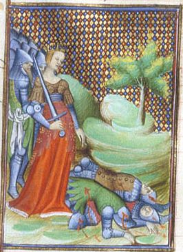 Londra, British Library, Royal 20 C V, f. 90v. Artemisia, in armatura e armata di spada, guida l'esercito contro gli abitanti di Rodi.