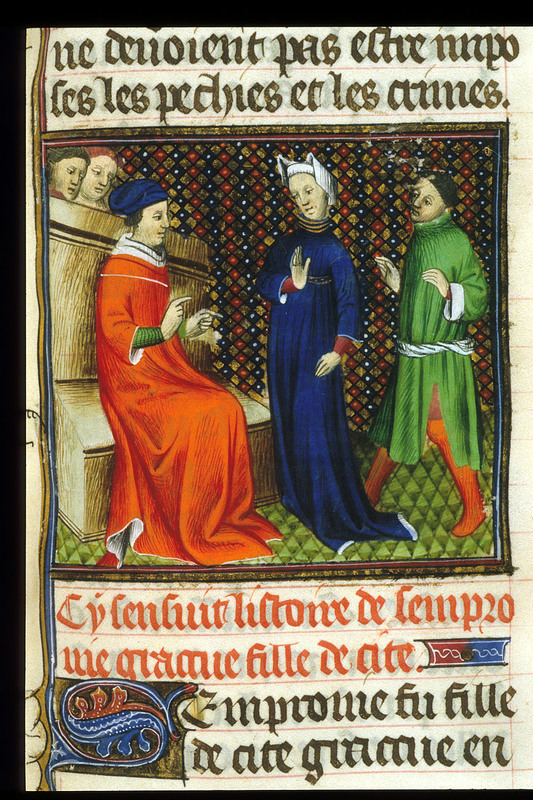 Londra, British Library, Royal 20 C V, f. 117r. Sempronia rifiuta di riconoscere il nipote Lucio Equizio di fronte all'assemblea dei plebei.