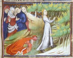Londra, British Library, Royal 20 C V, f. 128r. Sulpicia, abbandonati i suoi amici e spogliatasi del suo abito, segue il marito in esilio.