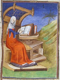 Londra, British Library, Royal 20 C V, f. 129r. Cornificia siede in cattedra intenta a scrivere un libro.