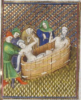 Londra, British Library, Royal 20 C V, f. 143r. Pompeia Paulina si suicida insieme al marito Seneca tagliandosi le vene nella vasca da bagno, assistita da quattro servitori.