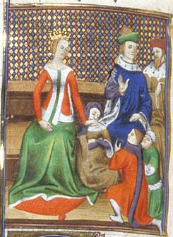 Londra, British Library, Royal 20 C V, f. 150v. Semiamira siede dinanzi ai senatori romani.