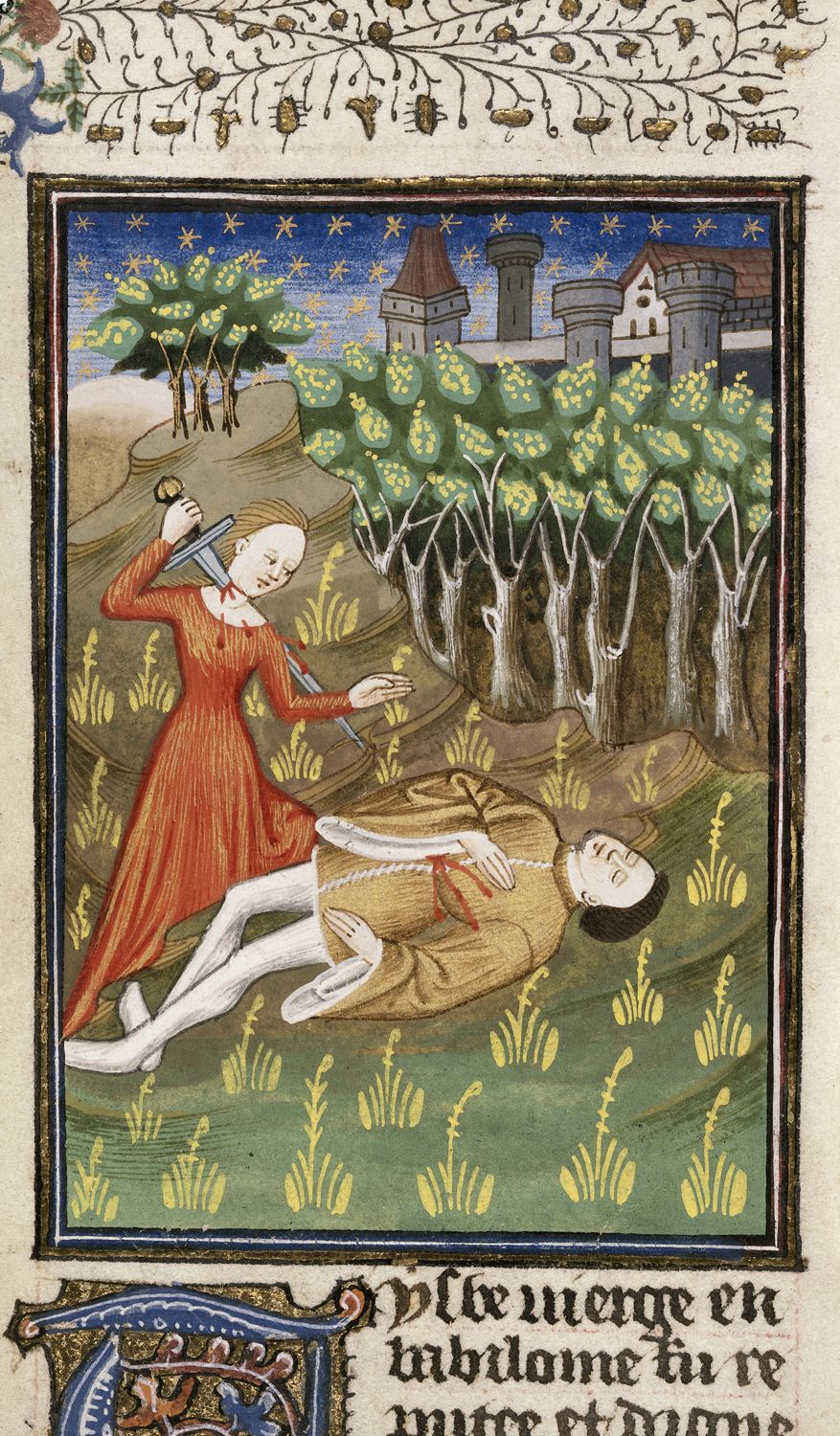 Londra, British Library, Royal 16 G V, f. 15r. Tisbe compie il suicidio accanto al corpo di Piramo.