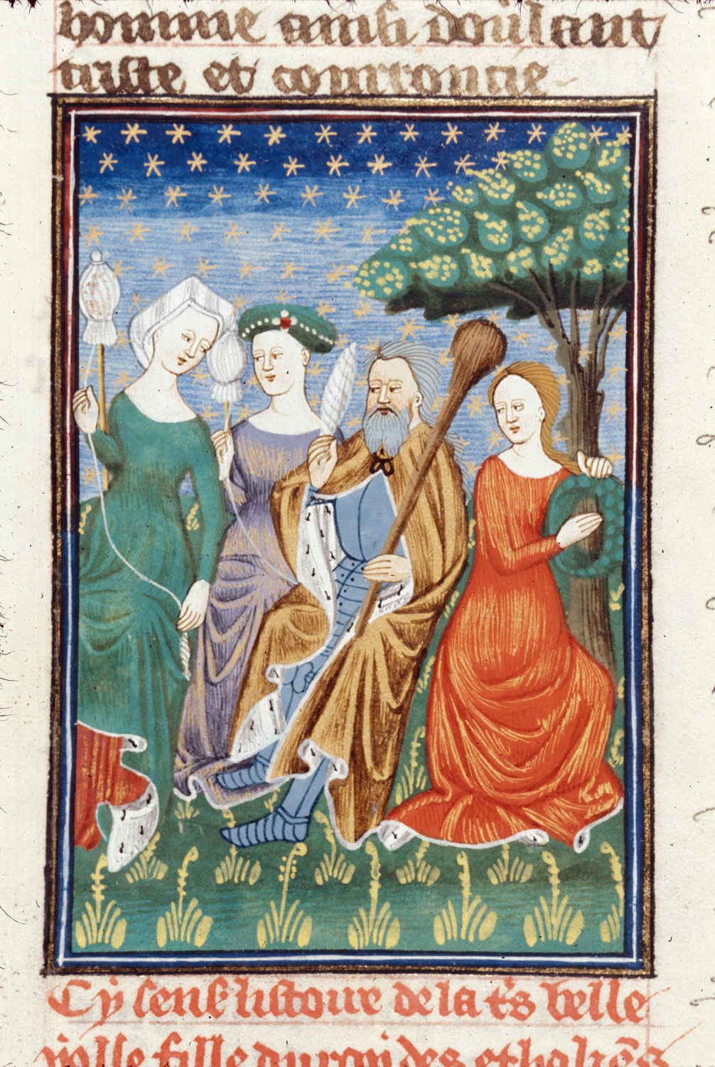 Londra, British Library, Royal 16 G V, f. 24v. Iole, con una ghirlanda tra le mani, siede nel giardino accanto ad Ercole, insieme a due fanciulle che filano.