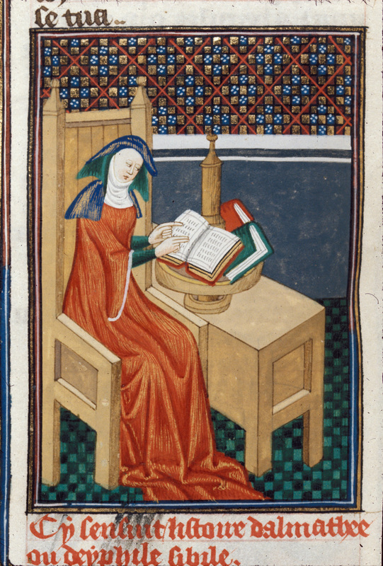 Londra, British Library, Royal 16 G V, f. 27v. La sibilla Amaltea legge in uno studio.