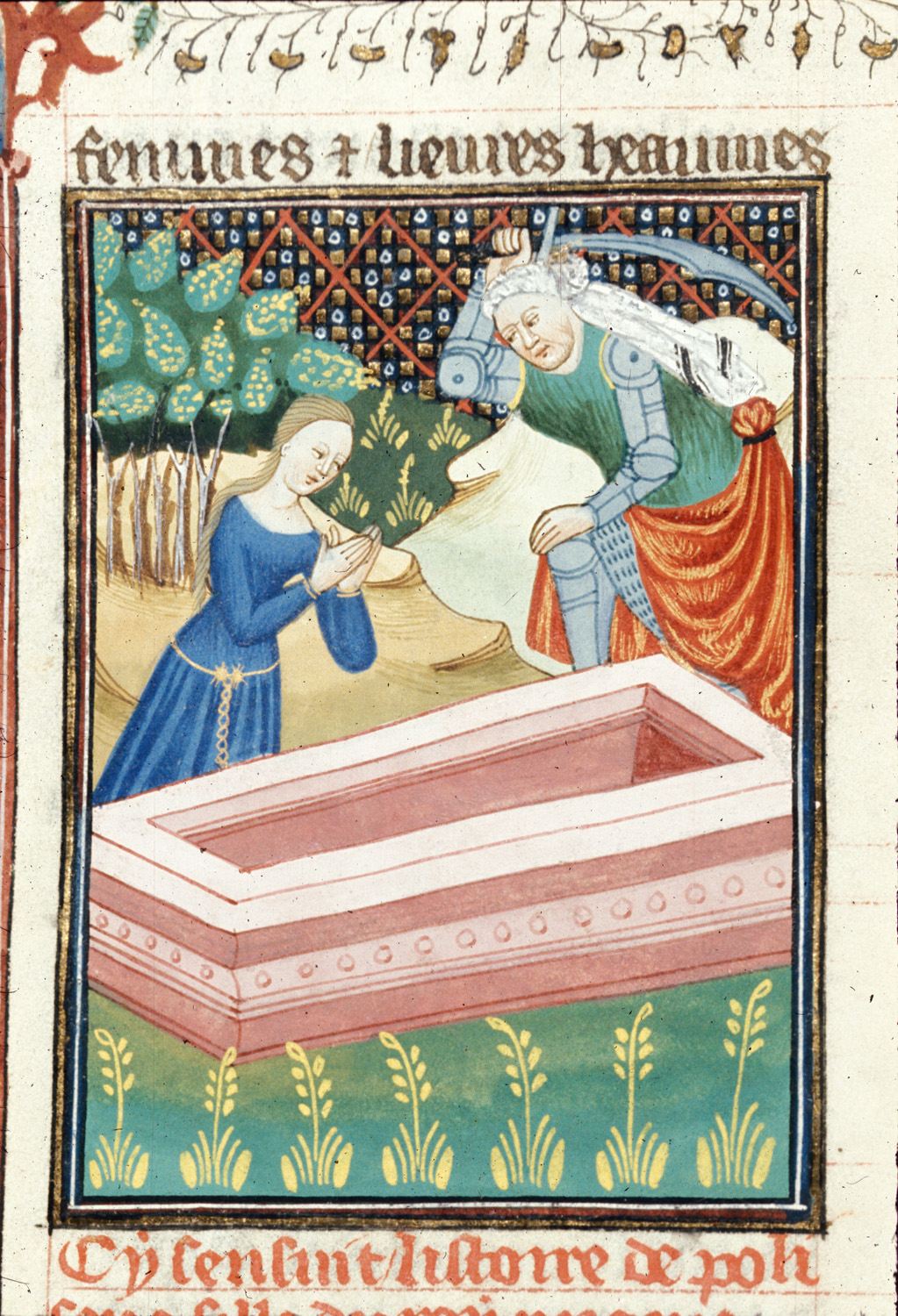 Londra, British Library, Royal 16 G V, f. 36v. Neottolemo solleva la spada per uccidere Polissena, la quale è inginocchiata in preghiera sulla tomba di Achille.