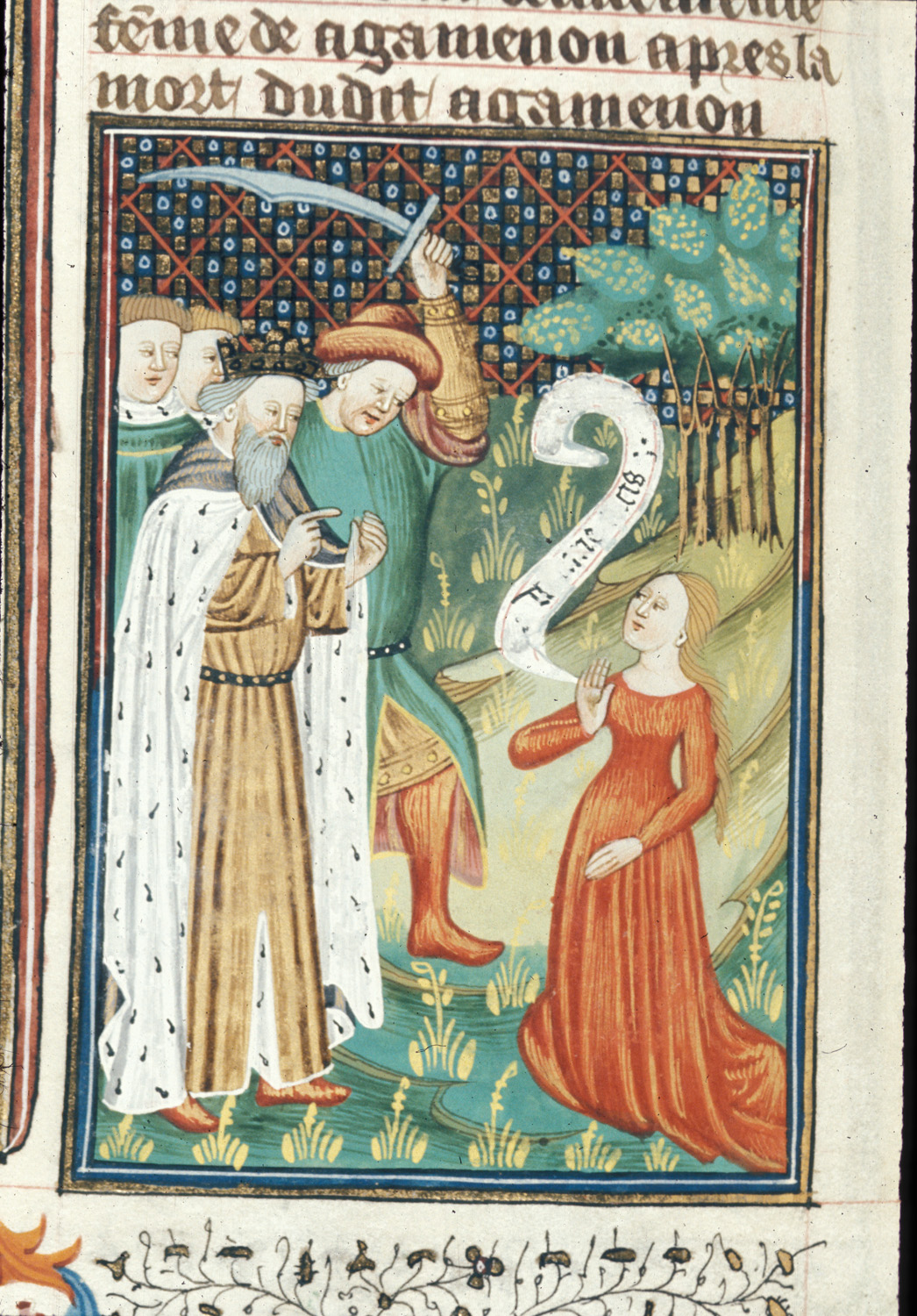 Londra, British Library, Royal 16 G V, f. 37v. Un soldato solleva la spada per uccidere Cassandra, la quale regge un cartiglio con la scritta "Domine tuas".
