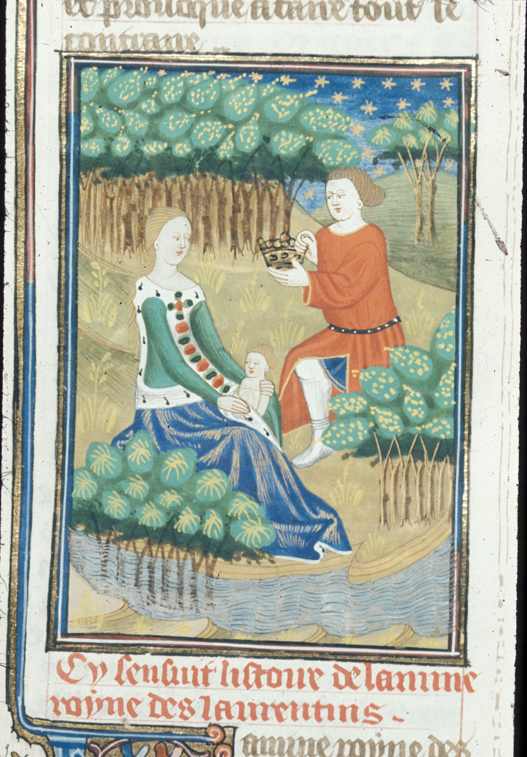 Londra, British Library, Royal 16 G V, f. 47v. Ascanio offre la sua corona a Lavinia, la quale siede con il figlio in grembo.
