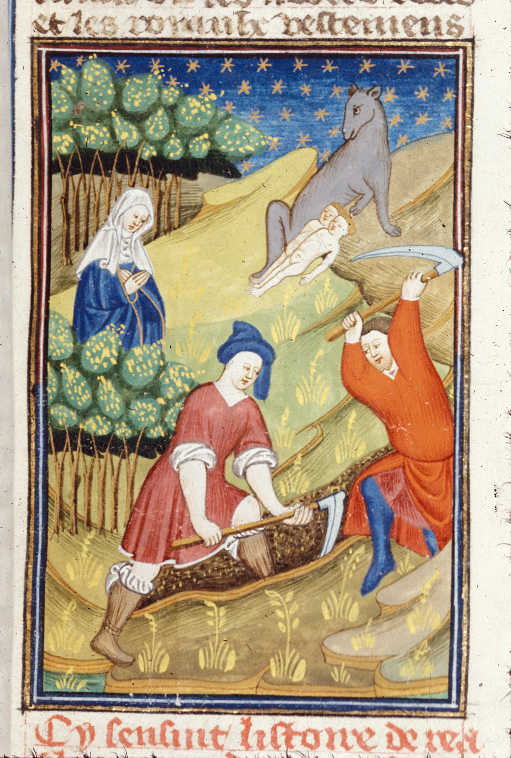 Londra, British Library, Royal 16 G V, f. 55r. Rea Silvia osserva due uomini scavare la fossa in cui sarà sepolta viva; poco lontano Romolo e Remo vengono trovati dalla lupa.