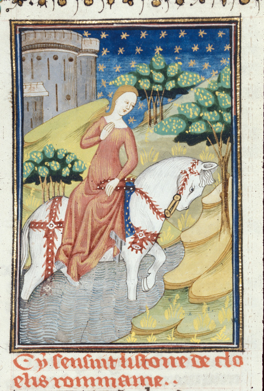 Londra, British Library, Royal 16 G V, f. 64v. Clelia attraversa il fiume a cavallo.