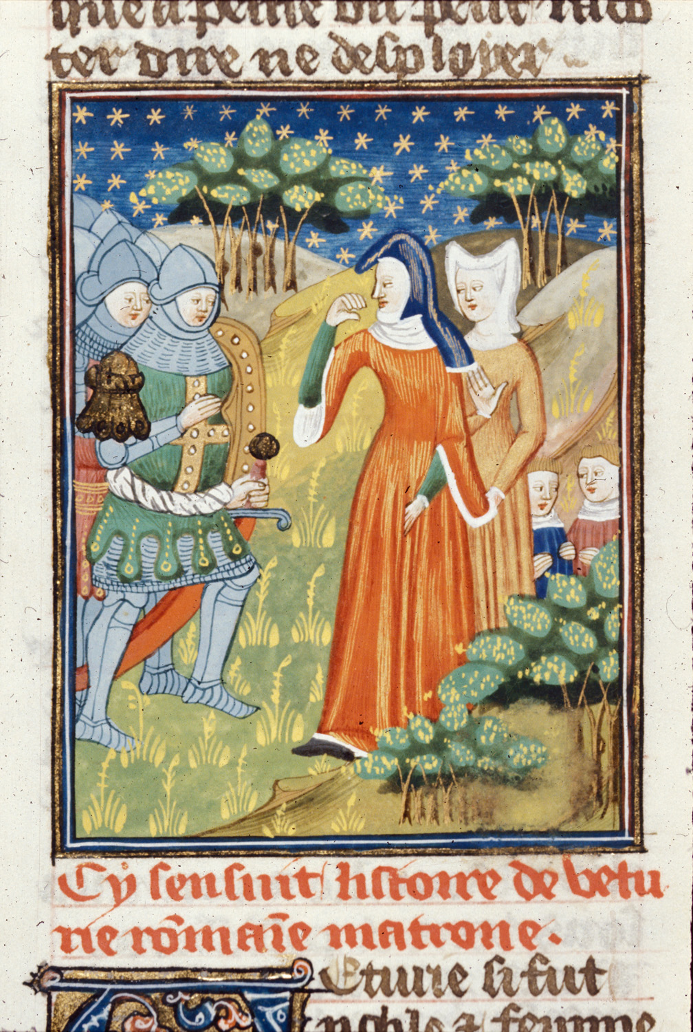 Londra, British Library, Royal 16 G V, f. 66v. Veturia, accompagnata dalla nuora Volumnia con i due giovani nipoti, dissuade il figlio Coriolano dal distruggere Roma.