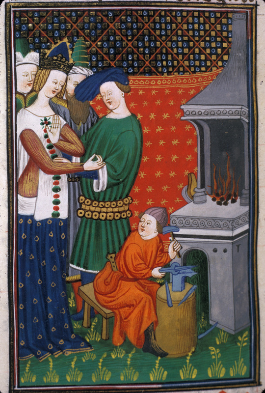 Londra, British Library, Royal 16 G V, f. 114v. Faustina insieme a tre amanti; un fabbro forgia del metallo su un'incudine.