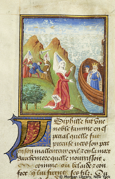 New York, Pierpont Morgan Library, M 381, f. 7r. Isifile aiuta il padre Toante a fuggire per mare mentre le donne di Lemno massacrano gli uomini dell'isola.
