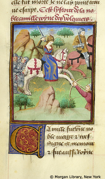 New York, Pierpont Morgan Library, M 381, f. 19r. Camilla, regina dei Volsci, partecipa alla battaglia in groppa a un destriero.