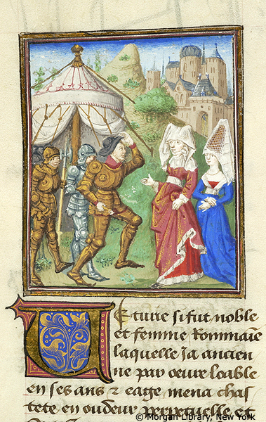 New York, Pierpont Morgan Library, M 381, f. 31v. Veturia, accompagnata da Volumnia, incontra suo figlio Coriolano presso l'accampamento e lo dissuade dal distruggere Roma.