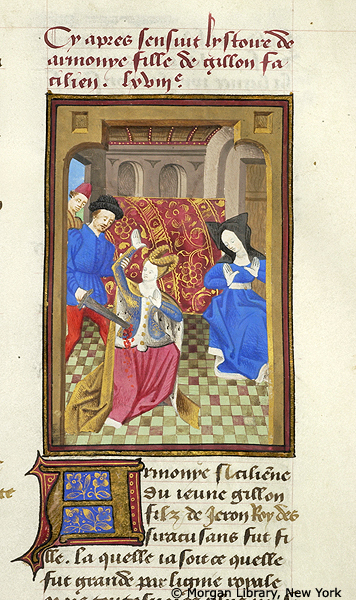 New York, Pierpont Morgan Library, M 381, f. 38r. Armonia, figlia di Gelone di Siracusa, viene assassinata.