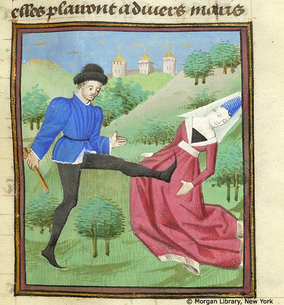New York, Pierpont Morgan Library, M 381, f. 58r. Nerone uccide la moglie Poppea Sabina prendendola a calci.