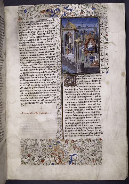 New York, Public Library, Spencer 33, f. 9r. Venere siede sul trono all'interno di un baldacchino rosso, circondata da tre coppie di innamorati; sulla sinistra un gruppo di devoti rende omaggio nel tempio alla statua della dea; sullo sfondo, nei pressi del porto, due prostitute adescano degli uomini.