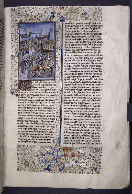 New York, Public Library, Spencer 33, f. 15r. Isifile siede sul trono in una piazza dinanzi alla pira funebre del marito, mentre le donne di Lemno massacrano gli uomini dell'isola; Isifile e i suoi due figli vengono catturati dai pirati e venduti come schiavi al re Licurgo.