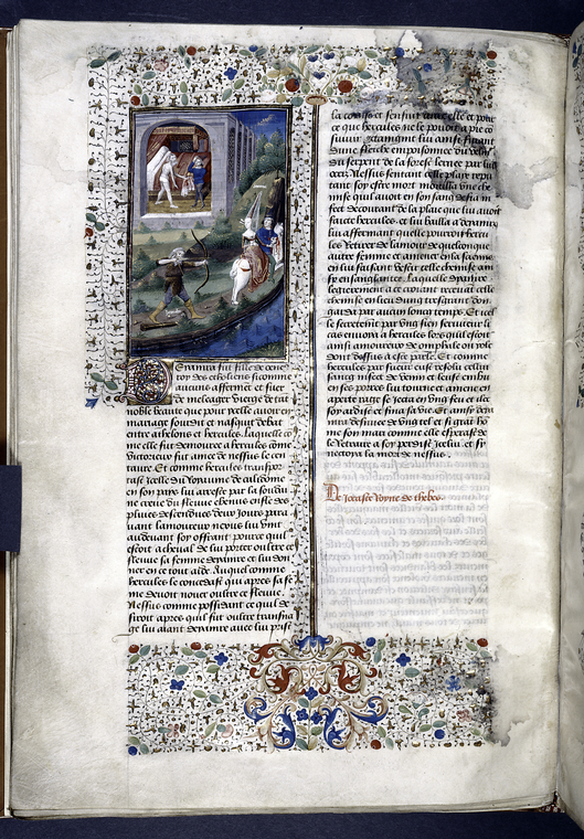 New York, Public Library, Spencer 33, f. 19v. Il centauro Nesso, mentre fugge lungo il fiume dopo aver rapito Deianira, viene colpito da una freccia di Ercole e si tampona la ferita con una tunica; un servitore presenta ad Ercole la tunica intrisa del sangue del centauro.