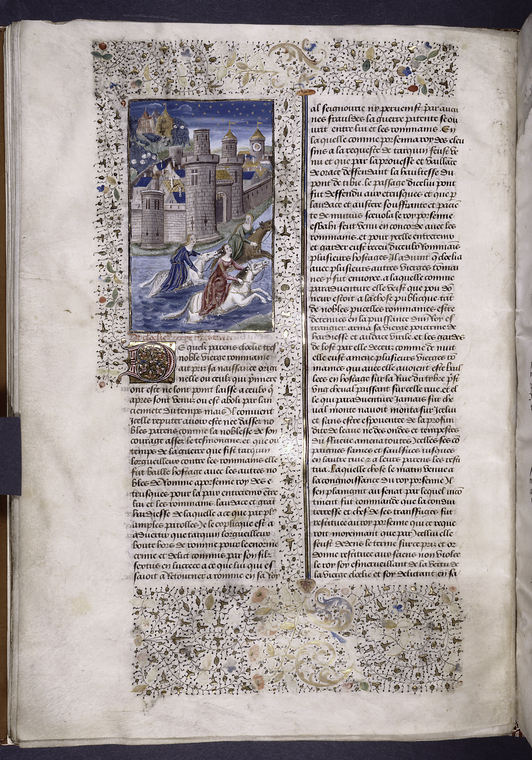 New York, Public Library, Spencer 33, f. 29v. Clelia e due fanciulle romane fuggono dall'accampamento etrusco e attraversano il Tevere a cavallo.