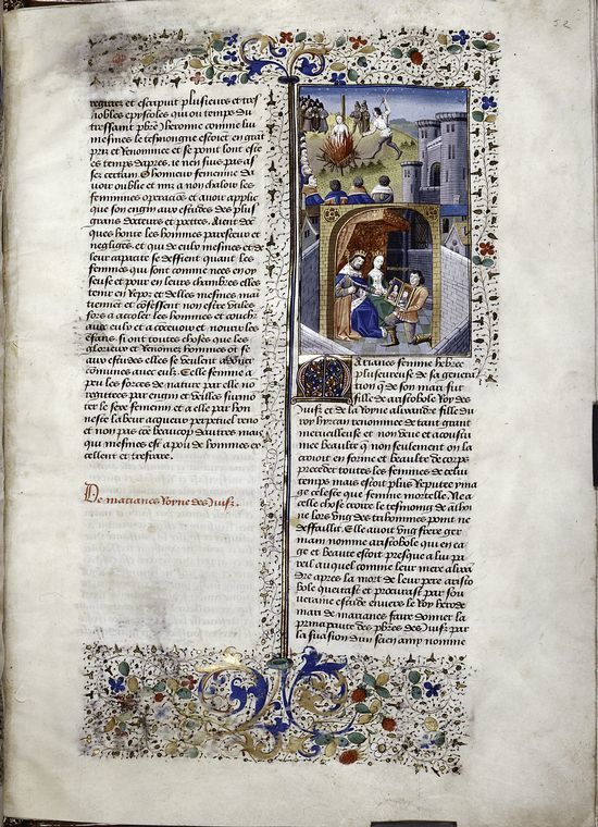 New York, Public Library, Spencer 33, f. 52r. Il doppio ritratto di Marianna e Aristobulo viene mostrato a una coppia regale; Marianna viene condannata al rogo.