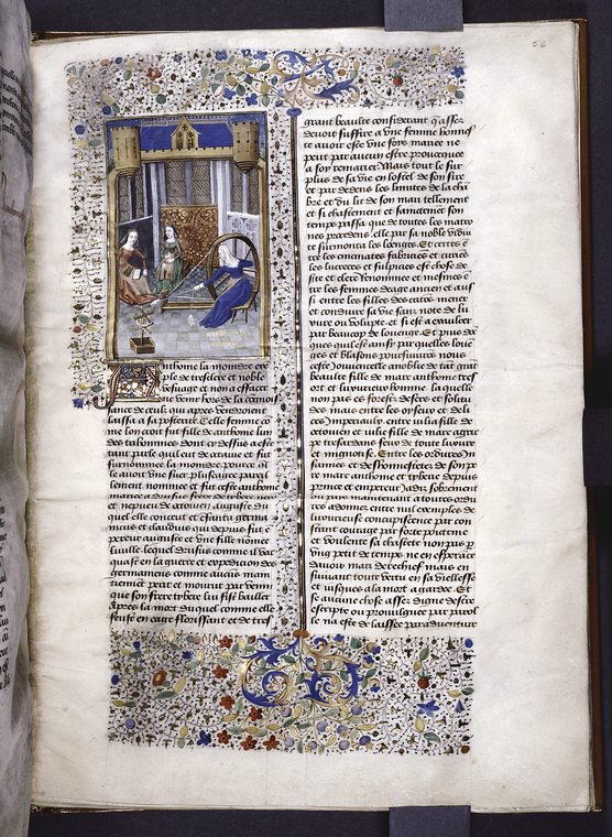 New York, Public Library, Spencer 33, f. 56r. Antonia, vedova di Druso, tesse al telaio in compagnia di due donne.