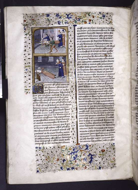 New York, Public Library, Spencer 33, f. 60v. Epicari viene torturata per ordine di Nerone; due uomini osservano il cadavere di Epicari.