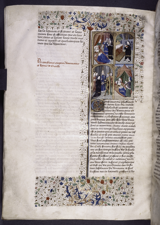 New York, Public Library, Spencer 33, f. 72v. Costanza appena nata viene affidata ad una monaca; Costanza d'Altavilla, in abiti monastici, legge un libro di preghiere nel monastero; Costanza sposa Enrico VI; Costanza partorisce il figlio Federico di Svevia.