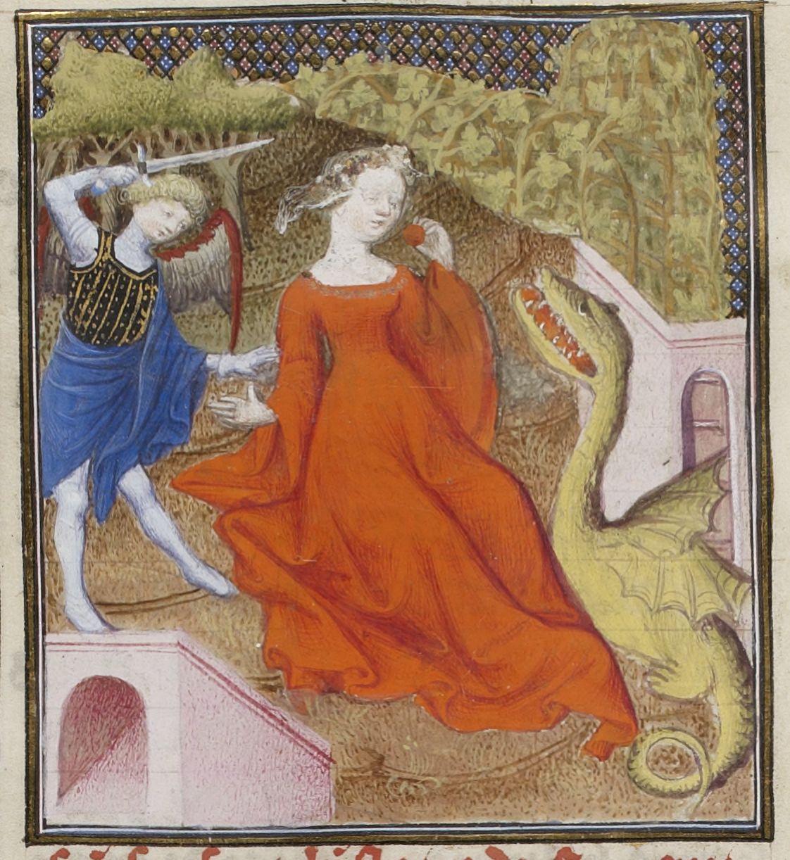 Parigi, Bibliothèque Nationale de France, Fr. 598, f. 6v. Nel giardino dell'Eden Eva mangia il frutto proibito tentata dal serpente (rappresentato come un drago); un angelo armato di spada si accinge a cacciarla dal Paradiso Terrestre.