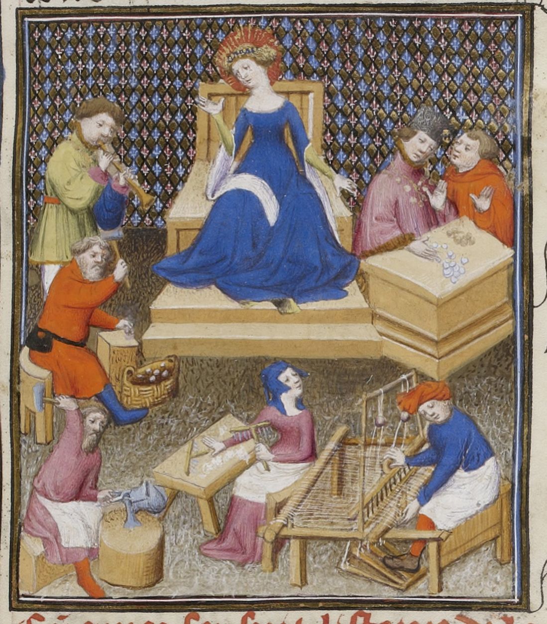 Parigi, Bibliothèque Nationale de France, Fr. 598, f. 14r. Minerva in trono circondata da uomini e donne che utilizzano i doni della dea: il pettine per la cardatura, il telaio, la fucina, l'olio d'oliva, il flauto, il calcolo.